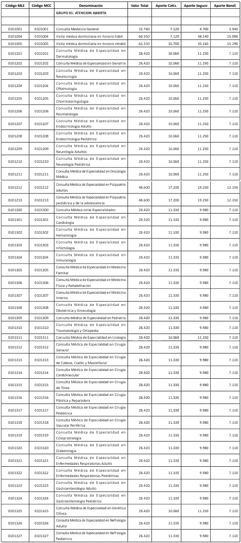 d) Prestaciones ambulatorias del Arancel MLE, que han sido reorganizadas en los siguientes grupos 01, 02 (códigos 0201405, 0201406, 0201407 y 0202501), 03, 04, 05, 06, 07, 08, 09, 13, 23, 24, 26, 29 y 31 (Anexo IV).
