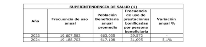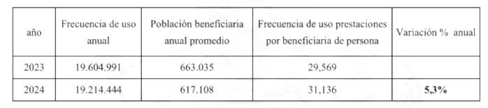 La frecuencia de uso de prestaciones bonificadas por beneficiario experimentó una variación de 5,3% durante el período 2023-2024, tal como se puede apreciar en la siguiente tabla: