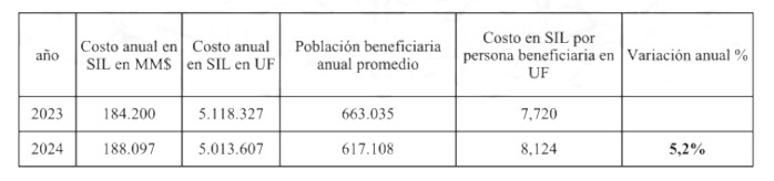 Corresponde a la variación del costo en SIL por persona beneficiaria en UF del año de análisis (2024), en relación con el año base (2023) y considera las licencias médicas reconsideradas por la Compin o por la propia Isapre.