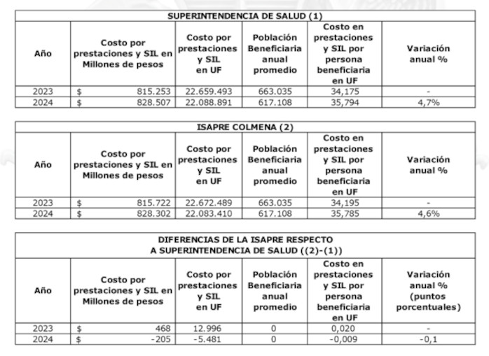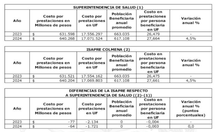 En resumen, la Superintendencia ha verificado que, para el año 2024, la variación de los costos de las prestaciones de salud de la Isapre Colmena alcanzó 4,5%, coincidiendo con el porcentaje estimado por la Isapre.