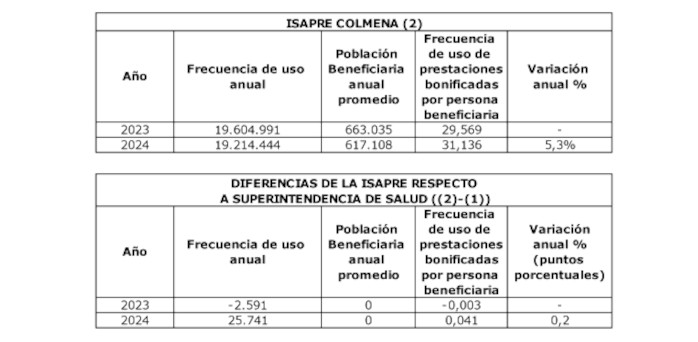En resumen, la Superintendencia ha verificado que, para el año 2024, la variación de la frecuencia de uso experimentada por las prestaciones de salud de Isapre Colmena alcanzó 5,1%, mientras que la Isapre estimó que esta variación fue de 5,3%.