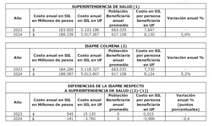 En resumen, la Superintendencia ha verificado que, para el año 2024, la variación del costo en Subsidios de Incapacidad Laboral (SIL) de Isapre Colmena alcanzó 5,6%, mientras que la Isapre estimó que esta variación fue de 5,2%.