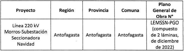 Artículo 2º.- El proyecto "Línea 220 kV Morros-Subestación Seccionadora Navidad", en adelante el "Proyecto", consiste en la construcción de una línea de transmisión de energía eléctrica compuesta de dos tramos, uno en circuito simple y el otro en circuito doble, cuyo objetivo es realizar el transporte de la energía generada por el Parque Eólico Morros y por el Parque Solar Japeado, desde la Subestación Elevadora Morros (proyectada) y la Subestación Elevadora Japeado (proyectada), respectivamente, hacia la Subestación Seccionadora Navidad (proyectada), permitiendo la inyección de dicha energía al Sistema Eléctrico Nacional (SEN), toda vez que la Subestación Seccionadora Navidad seccionará la Línea Eléctrica 1x220 kV Llanos del Viento - O'Higgins.