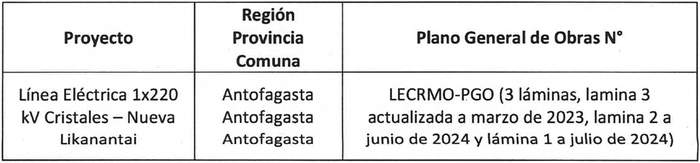 La longitud del Proyecto por la cual se otorga concesión es de 24.367,93 metros, comenzando su trazado en el punto PP, ubicado en el límite de la Subestación Cristales, en las coordenadas Este [m] 524.650,16 y Norte [m] 7.332.245,06, y finalizando en el punto PF, ubicado en el límite de la Nueva Subestación Likanantai, en las coordenadas Este [m] 516.603,76 y Norte [m] 7.315.759,64. Ambos puntos mencionados se encuentran dibujados en el Plano General de Obras LECRMO-PGO, el cual está compuesto de 3 láminas, y corresponden al sistema de coordenadas UTM WGS 84 del Huso 19S. La longitud de servidumbre eléctrica es de 24.347,83 metros, comenzando en el punto PP y terminando en el punto PF, ya indicados anteriormente, exceptuando un Bien Nacional de Uso Público.
