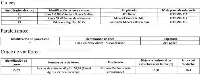 En su recorrido, el Proyecto afectará las siguientes líneas eléctricas, obras e instalaciones existentes: