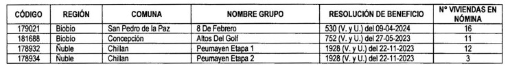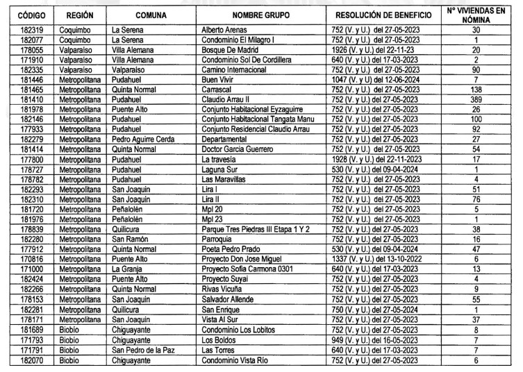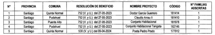 e) Que, de acuerdo a lo indicado por el Serviu de la región Metropolitana, en su correo electrónico del 9 de enero de 2025, en los proyectos citados a continuación fueron adscritas las siguientes familias de conformidad con lo dispuesto en el resuelvo 10 de la resolución del llamado: