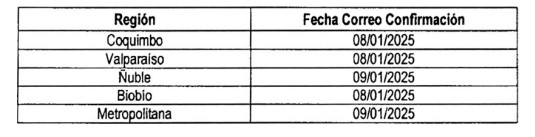 d) Que las regiones que participan del presente cierre confirmaron mediante correo electrónico el cumplimiento de los requisitos por parte de las familias postulantes, en las fechas que se señala a continuación: