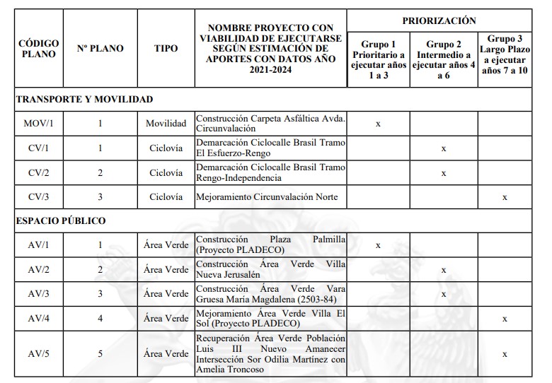 2. Modifíquese la Cartera de Proyectos Priorizada del "Plan de Infraestructura, Movilidad y Espacio Público (PIIMEP), Comuna de Linares", en el marco de la Ley Nº 20.958 de Aportes al Espacio Público, quedando de la siguiente manera: