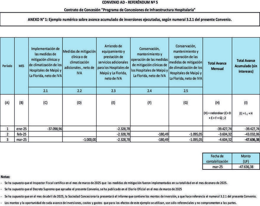 a) El monto por concepto de la implementación de las medidas de mitigación clínicas y de climatización de los Hospitales de Maipú y La Florida, a que se refiere el numeral 2.1 del presente Convenio, que sea certificado por el Inspector Fiscal será reconocido por única vez, con fecha del último día del mes que conste en la referida certificación del Inspector Fiscal como fecha de recepción a conformidad de las medidas de mitigación clínicas y de climatización, de ambos establecimientos de salud, ello según lo establecido en los párrafos segundo y tercero del numeral 1.1 del "Modelo de decreto supremo que se dictará al efecto", adjunto al Oficio Ord. IF-HOS N° 1472/2025, de fecha 24 de enero de 2025.