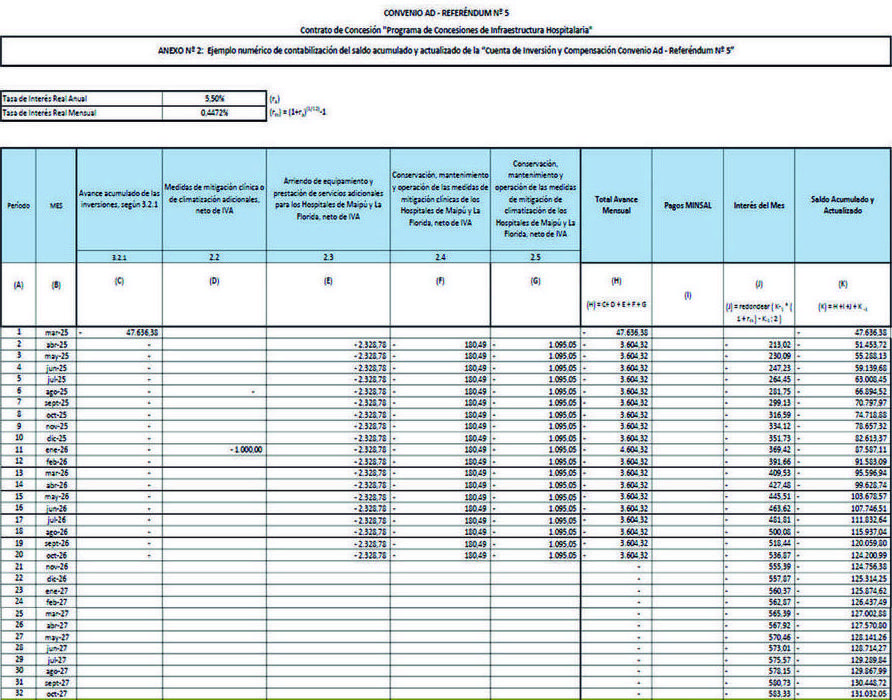 4.11 Una vez contabilizados en la "Cuenta de Inversión y Compensación Convenio Ad - Referéndum N° 5" la totalidad de los montos que corresponda según lo establecido en los numerales 3.2.1 y 3.2.2 del presente Convenio, y emitida la última de las Resoluciones por Valores Devengados materia de la presente cláusula, en un plazo máximo de 30 días, contado desde la fecha de emisión de dicha Resolución, el Inspector Fiscal deberá presentar al Ministerio de Salud un informe donde se certifiquen los montos comprometidos en las Resoluciones por Valores Devengados que hubiese suscrito junto a la Sociedad Concesionaria, determinando el detalle de los pagos futuros que deberá efectuar el Minsal para cumplir los citados compromisos.