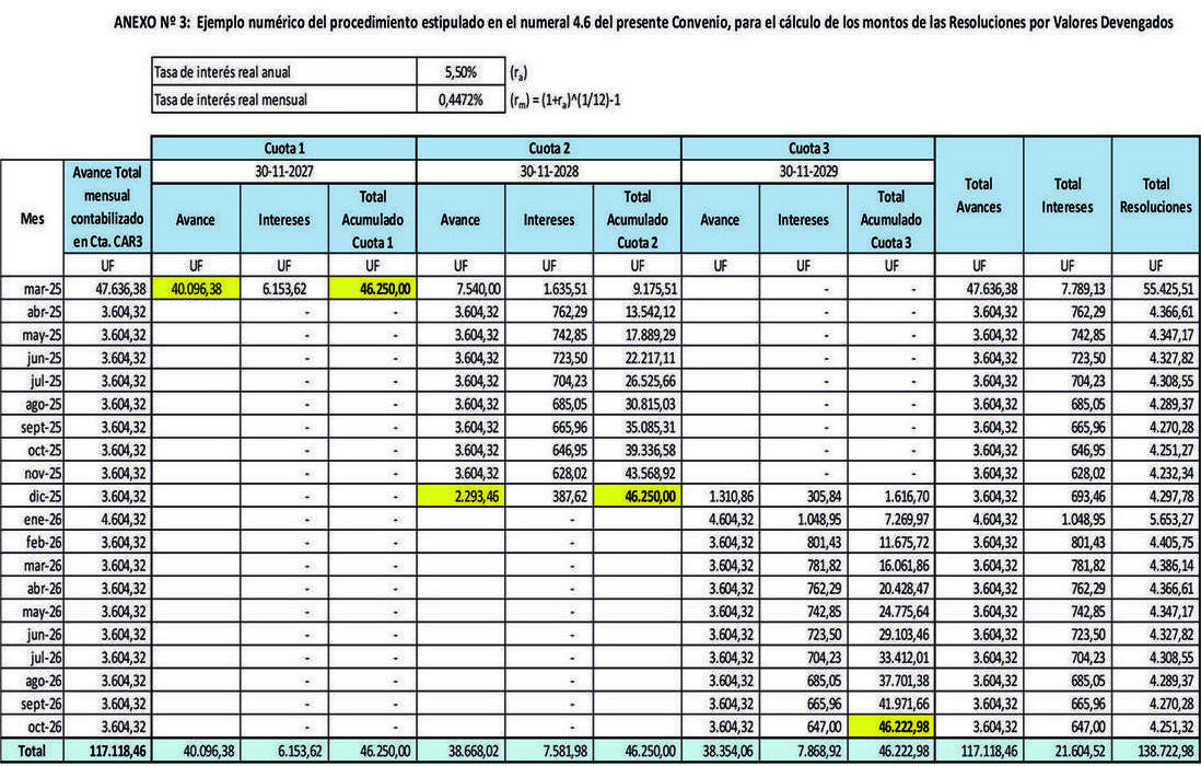4.6 Si a la fecha de la emisión de cada una de las resoluciones, el monto comprometido en las Resoluciones por Valores Devengados ya emitidas, incluyendo los intereses calculados a la fecha de pago correspondiente, es menor o igual a la suma señalada en el literal a. del numeral 4.1 del presente Convenio, éstas serán pagadas en la fecha de pago señalada en dicho literal a. Por su parte, las sumas calculadas, incluyendo los intereses correspondientes, que excedan la cantidad señalada en el literal a. del numeral 4.1, serán pagadas en la fecha señalada en el literal b. del mismo numeral, adicionándose a dicho excedente los intereses que correspondan, utilizando para ello una tasa real anual equivalente a 5,5%, expresada en su fracción mensual compuesta, por el tiempo que transcurra entre la fecha del literal a. y la fecha del literal b. del numeral 4.1. Las sumas calculadas, incluyendo los intereses correspondientes, que excedan la cantidad señalada en el literal b. del numeral 4.1 serán pagadas en la fecha señalada en el literal c. del mismo numeral, adicionándose a dicho excedente los intereses que correspondan, utilizando para ello una tasa real anual equivalente a 5,5%, expresada en su fracción mensual compuesta, por el tiempo que transcurra entre la fecha del literal b. y la fecha del literal c. del numeral 4.1.