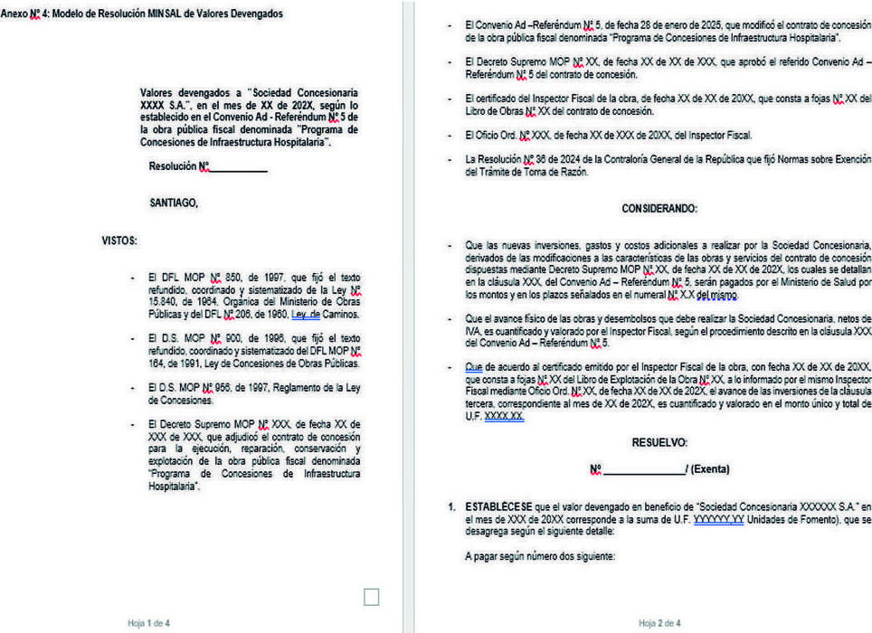 4.2 Los pagos indicados precedentemente corresponderán a la suma de los montos reconocidos mediante la emisión de Resoluciones Minsal, llamadas por "Valores Devengados", de acuerdo al modelo de Resolución contenido en el Anexo N° 4 del presente Convenio, las que se emitirán acorde al avance de las inversiones, costos y gastos efectuados por la Sociedad Concesionaria, contabilizados en la "Cuenta de Inversión y Compensación Convenio Ad-Referéndum N° 5", conforme se indica en la cláusula tercera del presente Convenio, previa aprobación y certificación del Inspector Fiscal de conformidad a lo indicado en el numeral 4.3 siguiente.
