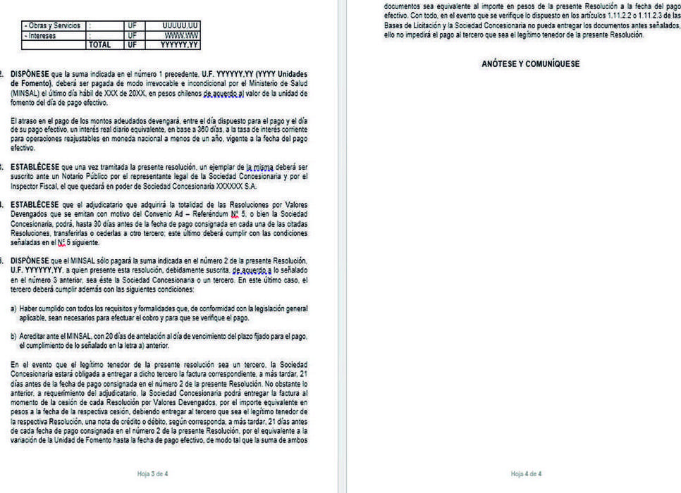 En virtud de lo anterior, el Minsal pagará las resoluciones, a su vencimiento, al tercero que sea el legítimo tenedor de las mismas o, en caso contrario, a la Sociedad Concesionaria. Estas resoluciones no podrán ser prepagadas por el Minsal, salvo con el consentimiento del legítimo tenedor de la respectiva Resolución, esto es, la Sociedad Concesionaria o el adquirente de éstas.