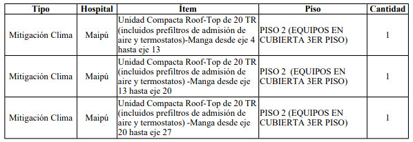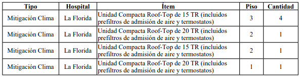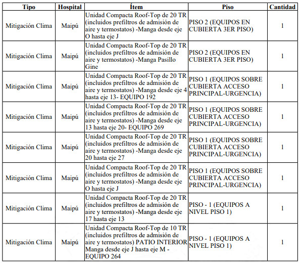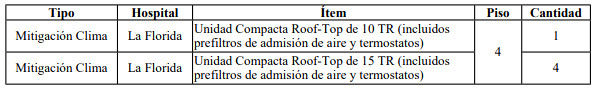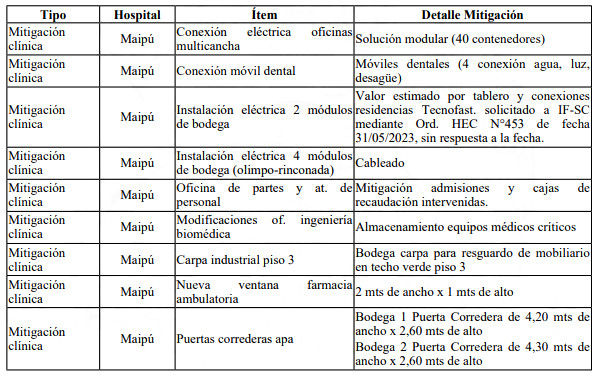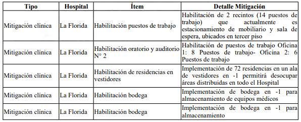 Las medidas de mitigación clínicas y de climatización, incluyendo el arriendo de equipamiento y prestación de servicios adicionales, por hospital, se resumen en las siguientes tablas: