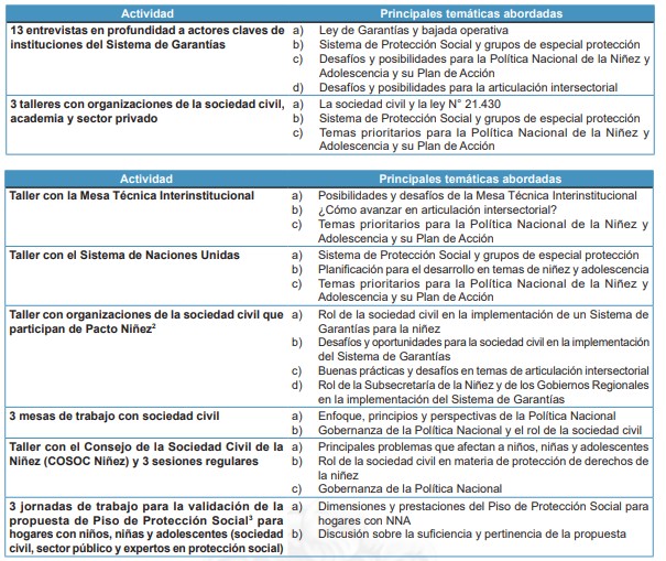 Siguiendo la ley N° 21.430, sobre Garantías y Protección Integral de los Derechos de la Niñez y Adolescencia, y la Recomendación sobre pisos de protección social, 2012 (núm. 202) de la Organización Internacional del Trabajo (OIT), este organismo internacional, en conjunto con el Fondo de las Naciones Unidas para la Infancia (Unicef), crearon una nota conceptual que define un piso de protección social para la niñez en Chile. Dicho documento proporciona un marco teórico, propone dimensiones y prestaciones específicas y, con el apoyo de la Subsecretaría de la Niñez, se ha traducido en compromisos dentro del Plan de Acción para establecer un piso de protección social adaptado a los derechos de la niñez y escalable según el progreso del país.