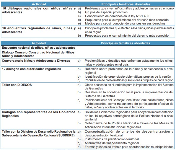 (29) Creado mediante Ley de Garantías. Su forma de funcionamiento e integrantes está regulada en el reglamento que establece la forma de funcionamiento del Consejo Consultivo Nacional de Niños, Niñas y Adolescentes, aprobado por el decreto N° 10, de 2022, del Ministerio de Desarrollo Social y Familia, Subsecretaría de la Niñez, Para mayores detalles, ver: https://www.bcn.cl/leychile/navegar?idNorma=1194987