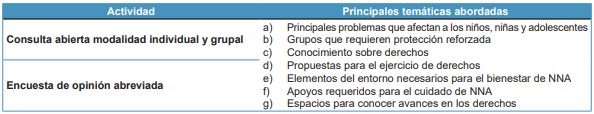 16° Que, en la última y quinta etapa, se revisaron los datos disponibles y necesarios para establecer metas e indicadores de resultado para cada objetivo estratégico y se construyó una propuesta para ser discutida y abordada con las respectivas autoridades que forman parte de la Mesa de Articulación Interinstitucional Nacional; además de llevarse a cabo un proceso amplio participativo, con el objeto de conocer la opinión de los actores consultados, a saber, la sociedad civil, el Consejo de la Sociedad Civil de Niñez, opinión de niños, niñas y adolescentes, el Consejo Consultivo Nacional de Niños, Niñas y Adolescentes, equipos ministeriales y de servicios públicos a nivel nacional y regional, equipos locales representantes de las Oficinas Locales de la Niñez y de las Oficinas de Protección de Derechos, Defensoría de los Derechos de la Niñez, entre otros, y expertos en materia de niñez y adolescencia.