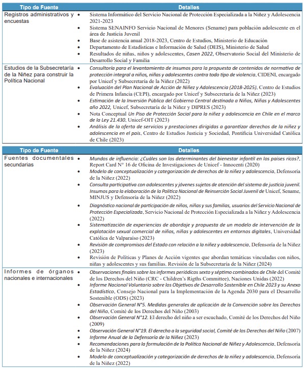 A fin de establecer indicadores que permitan monitorear y evaluar el progreso hacia el cumplimiento de los objetivos establecidos, se ha realizado un levantamiento de fuentes de información oficial, tanto de datos administrativos como de encuestas.