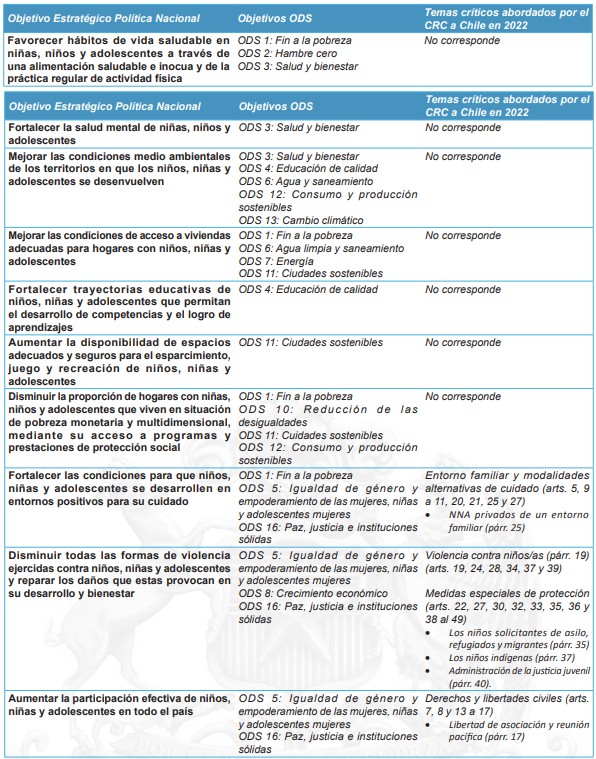 6° Que, el artículo 80 de la ley N° 21.430, dispone que la política que se formule deberá contener, a lo menos, un diagnóstico de la situación de la niñez y adolescencia en el país, sus objetivos y fines estratégicos, distinguiendo áreas y materias; orientaciones y ejes de acción dirigidos al cumplimiento de dichos objetivos y fines, considerando criterios de descentralización y desconcentración, según corresponda. Que, la Política Nacional de la Niñez y Adolescencia y su Plan de Acción asegurarán que el Sistema de Garantías y Protección Integral de los Derechos de la Niñez y Adolescencia sea de carácter universal, coordinado, integral, sistémico e intersectorial.
