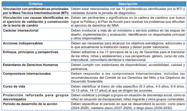 Para establecer compromisos, se definieron criterios que las acciones deben cumplir dentro del marco de la Política Nacional de Niñez y Adolescencia y su Plan de Acción.