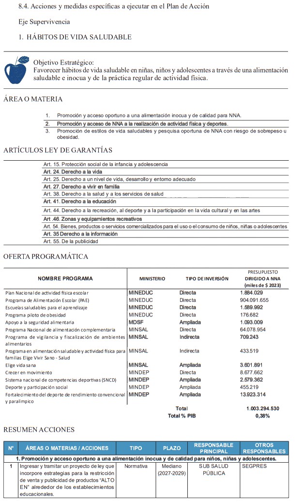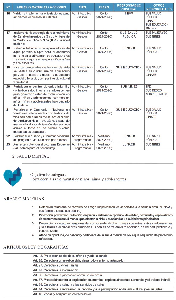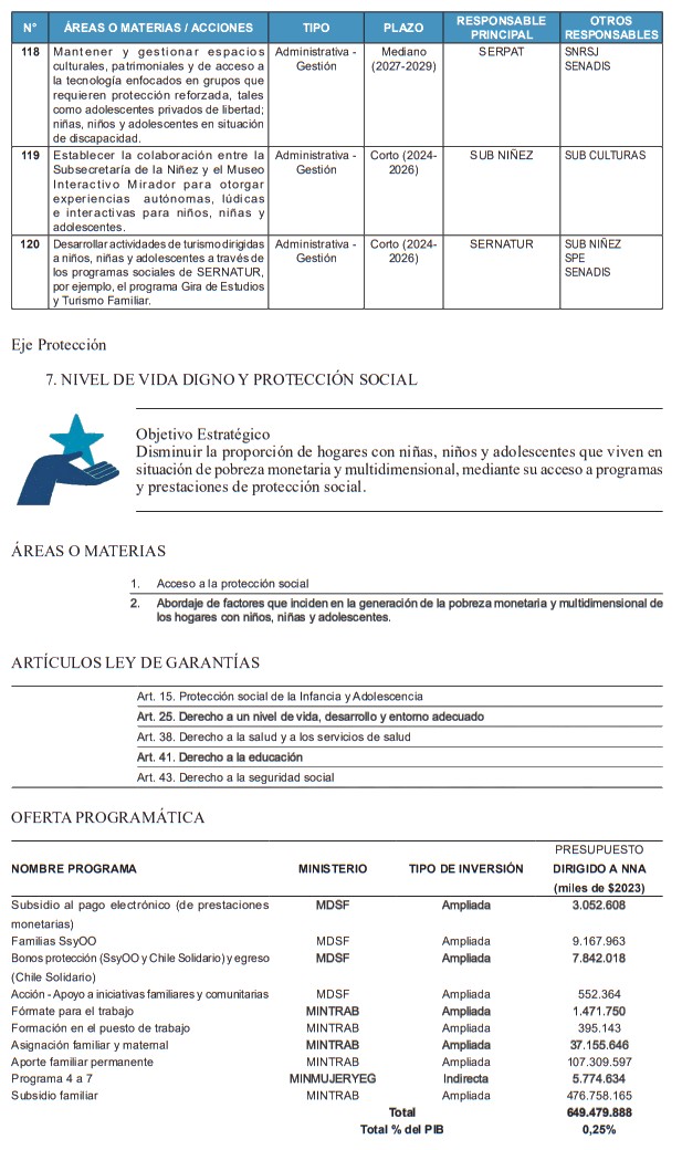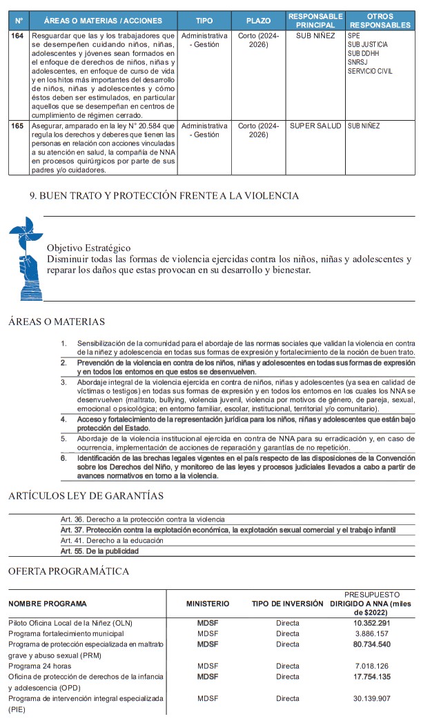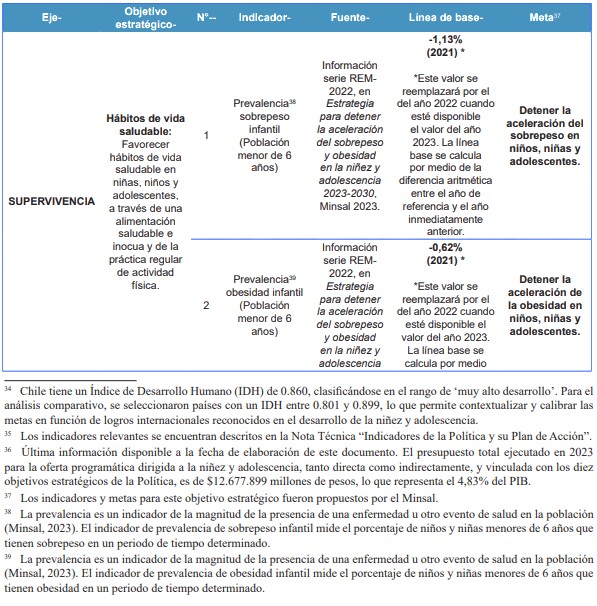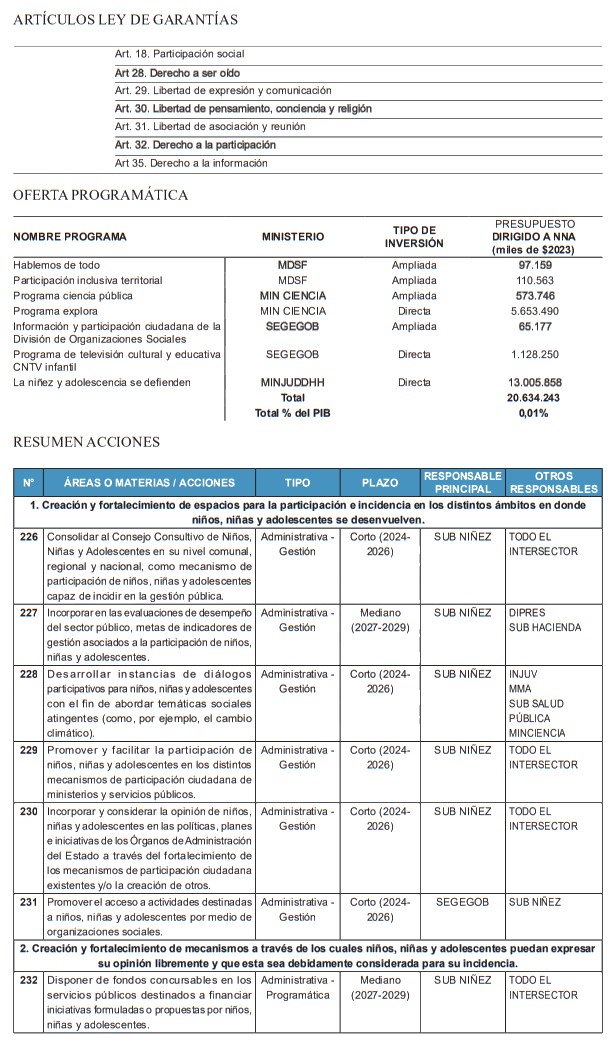 A continuación, se presentan los indicadores clave y las metas acordadas con las instituciones que participaron en la Política y su Plan de Acción (35) . Posteriormente, se detallan las acciones y medidas específicas a ejecutar en el Plan de Acción. Para esto, se describe el objetivo estratégico, seguido por las áreas o materias vinculadas, los derechos de la Ley de Garantías asociados y la oferta programática. Al respecto, se informan los programas vigentes al cierre del año 2023 según el Banco Integrado de Programas Sociales del Ministerio de Desarrollo Social y Familia y su presupuesto asociado en pesos para el mismo año (36) .