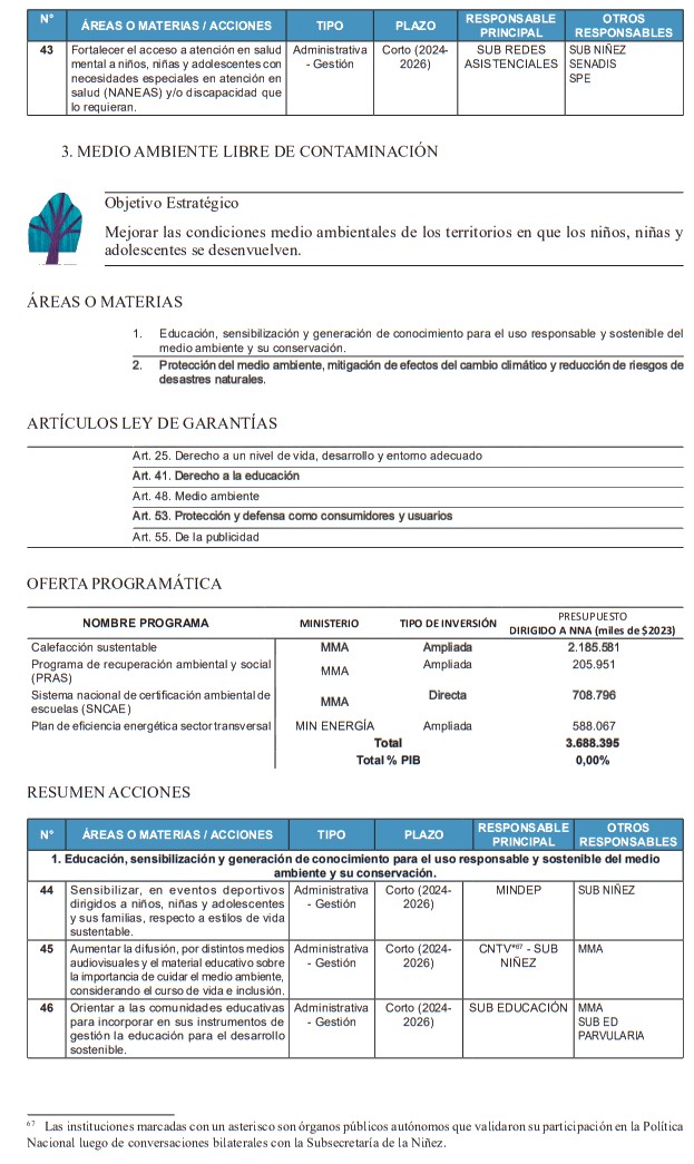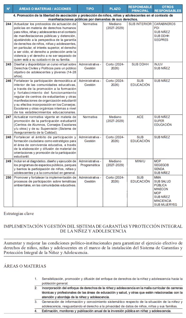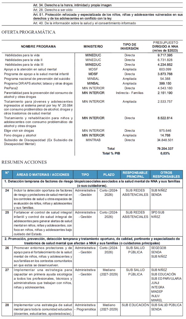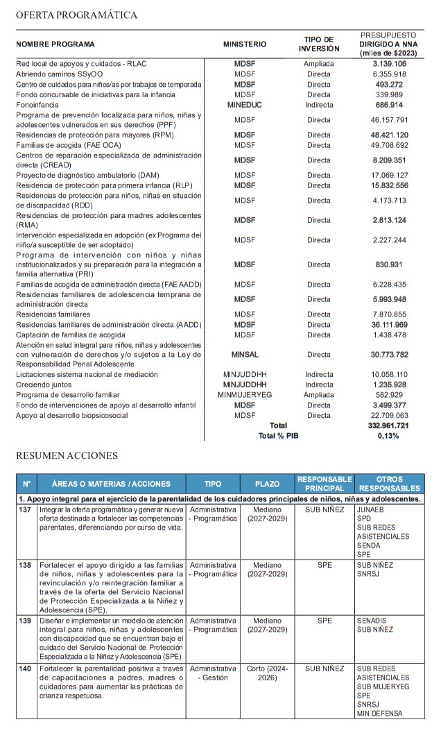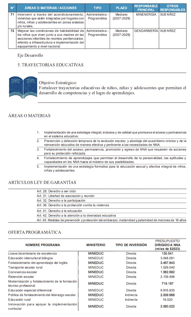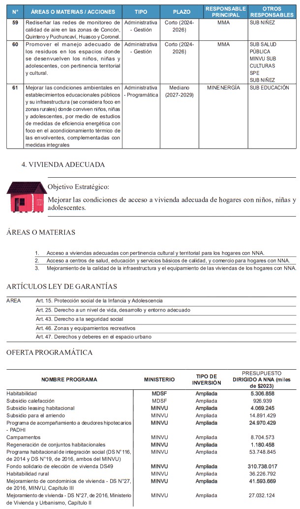 A continuación, se presentan los indicadores clave y las metas acordadas con las instituciones que participaron en la Política y su Plan de Acción (35) . Posteriormente, se detallan las acciones y medidas específicas a ejecutar en el Plan de Acción. Para esto, se describe el objetivo estratégico, seguido por las áreas o materias vinculadas, los derechos de la Ley de Garantías asociados y la oferta programática. Al respecto, se informan los programas vigentes al cierre del año 2023 según el Banco Integrado de Programas Sociales del Ministerio de Desarrollo Social y Familia y su presupuesto asociado en pesos para el mismo año (36) .