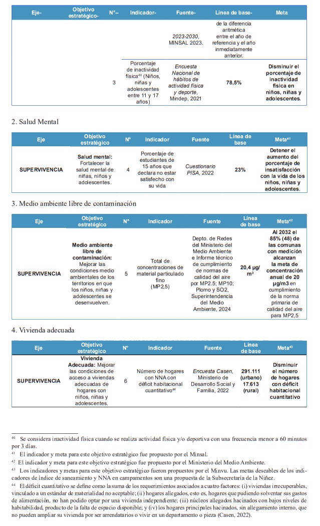 Los indicadores relevantes se seleccionaron considerando los siguientes criterios: i) vinculación con el objetivo estratégico o sus respectivas áreas o materias, ii) rango de edad, el indicador aborda un tramo de edad amplio entre los 0 y 17 años (inclusive), iii) periodicidad, es decir, que el indicador sea medible de manera constante en el tiempo, iv) urgencia, el indicador muestra un comportamiento negativo en el tiempo para las condiciones de vida de niños, niñas y adolescentes, lo cual releva la urgencia de abordar la temática y v) comparabilidad, es decir, existe un parámetro internacional para comparar entre países.