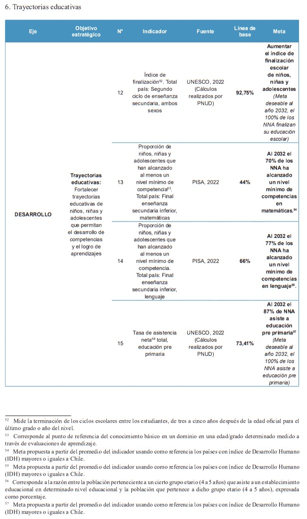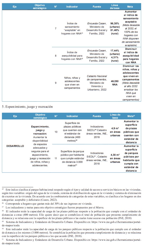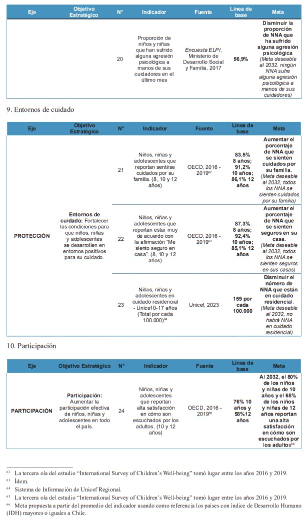 c. Metas deseables, formuladas a partir de definiciones normativas o deseables, considerando el nivel de desarrollo actual que cuenta el país o bien que son materia de consenso respecto a mínimos que deben asegurarse a NNA y que fijan horizontes para la implementación de políticas públicas dirigida a este grupo de la población.