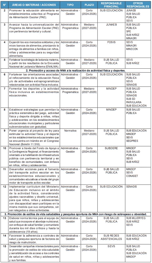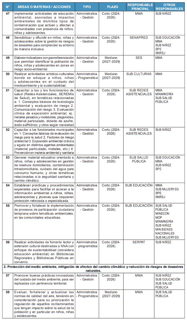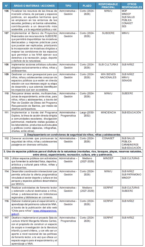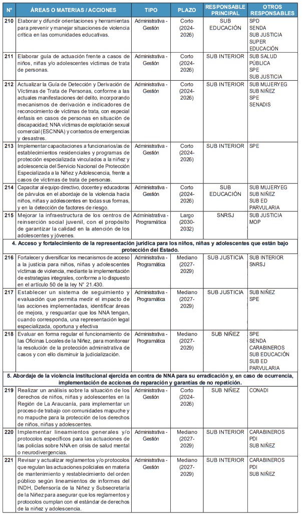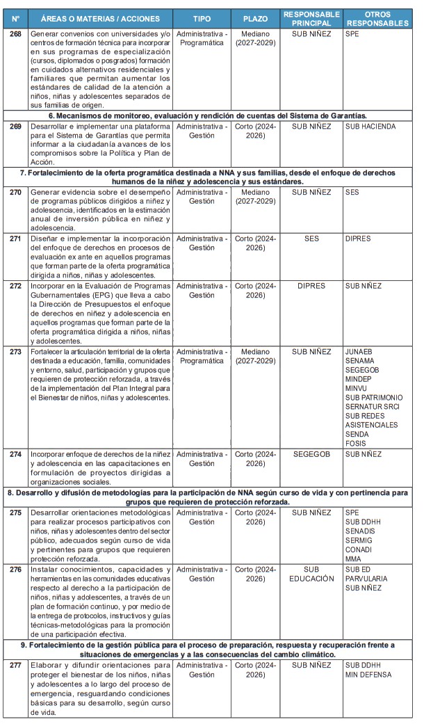 7° Que, el artículo 81 de la ley N° 21.430, establece que el plan de acción ya referido deberá contener, a lo menos, a) los derechos y garantías de la niñez y la adolescencia que se abordarán; b) los programas o líneas programáticas que lo integran; c) las acciones y medidas específicas a ejecutar; d) los plazos de ejecución; e) los órganos y cargos responsables; f) las metas para sus acciones y medidas, y g) los indicadores necesarios para su evaluación.