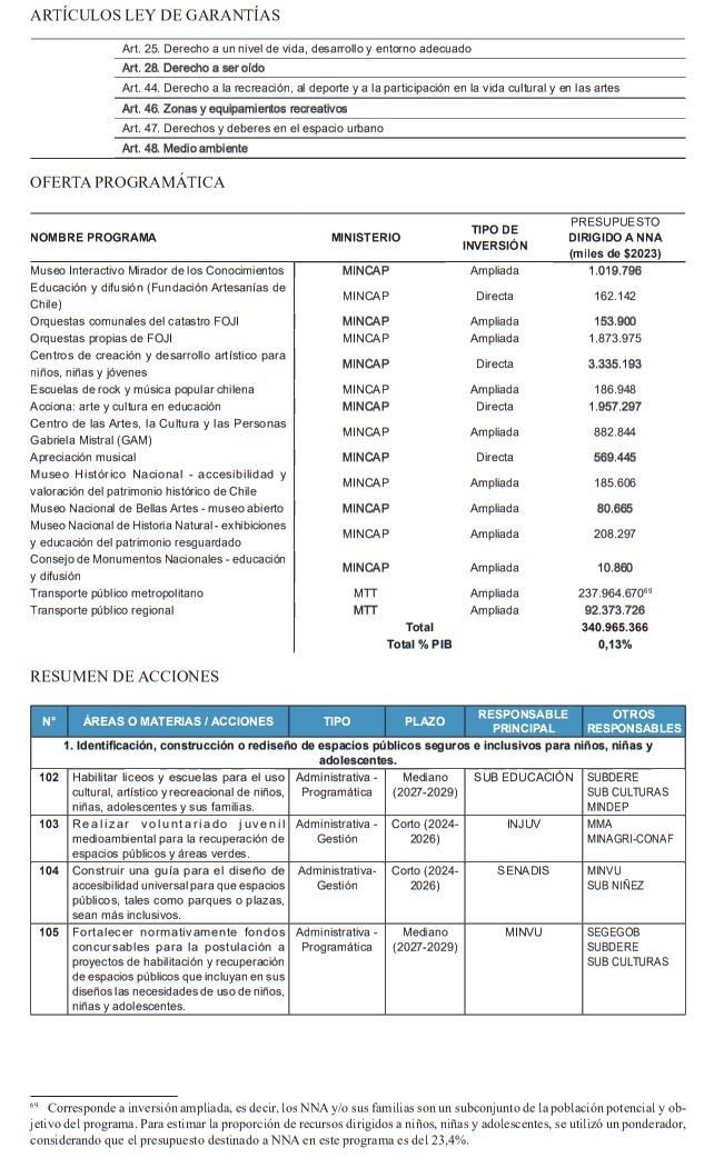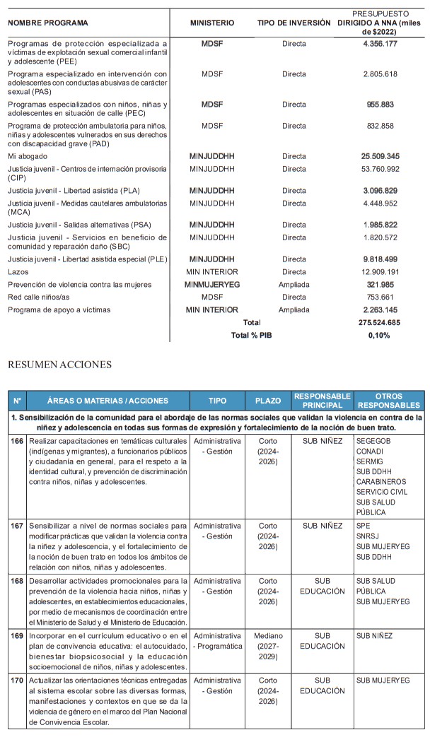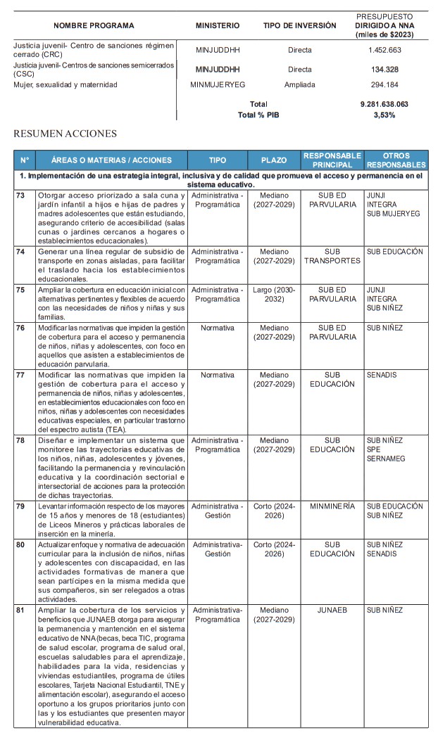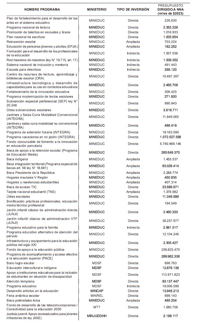 (33) La categorización corresponde a la metodología empleada en el estudio "Estimación de la Inversión Pública (Gasto) del Gobierno Central Destinado a Niños, Niñas y Adolescentes año 2022" (UNICEF, Subsecretaría de la Niñez y DIPRES, 2023).