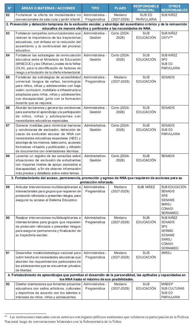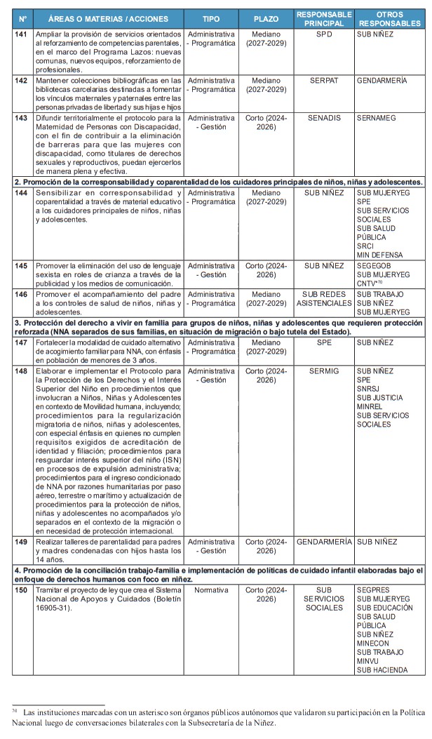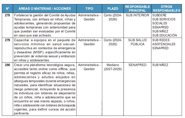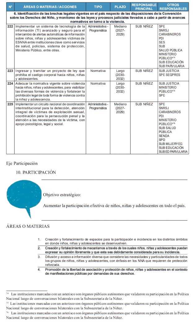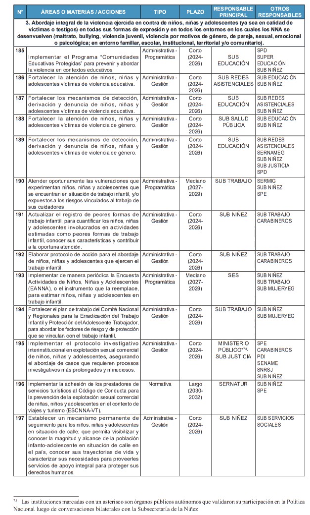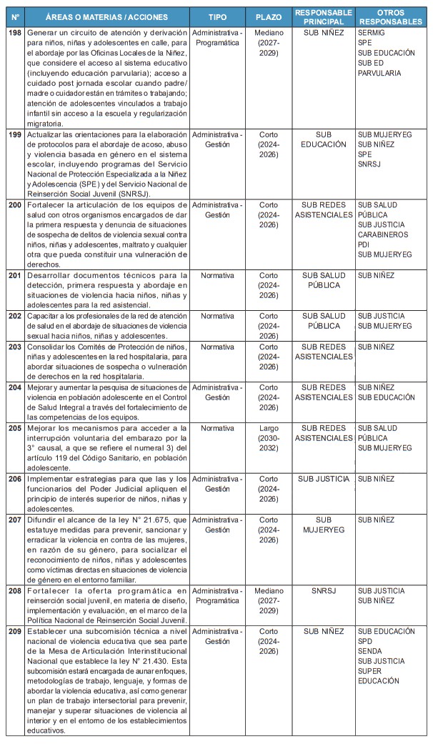 . Comisión Técnica Interinstitucional : comisión ad hoc asociada a la MAIN que tiene como propósito apoyar la función de monitoreo de la Política Nacional y su Plan de Acción. Está integrada por representantes de Ministerios y Servicios Públicos con acciones comprometidas en la Política Nacional y el Plan de Acción y coordinada por la Subsecretaría de la Niñez. Su funcionamiento se realizará mediante subcomisiones asociadas a los objetivos estratégicos establecidos para la Política, las cuales sesionarán trimestralmente. (31)