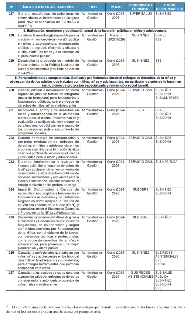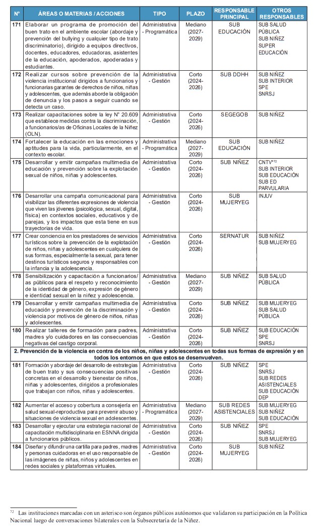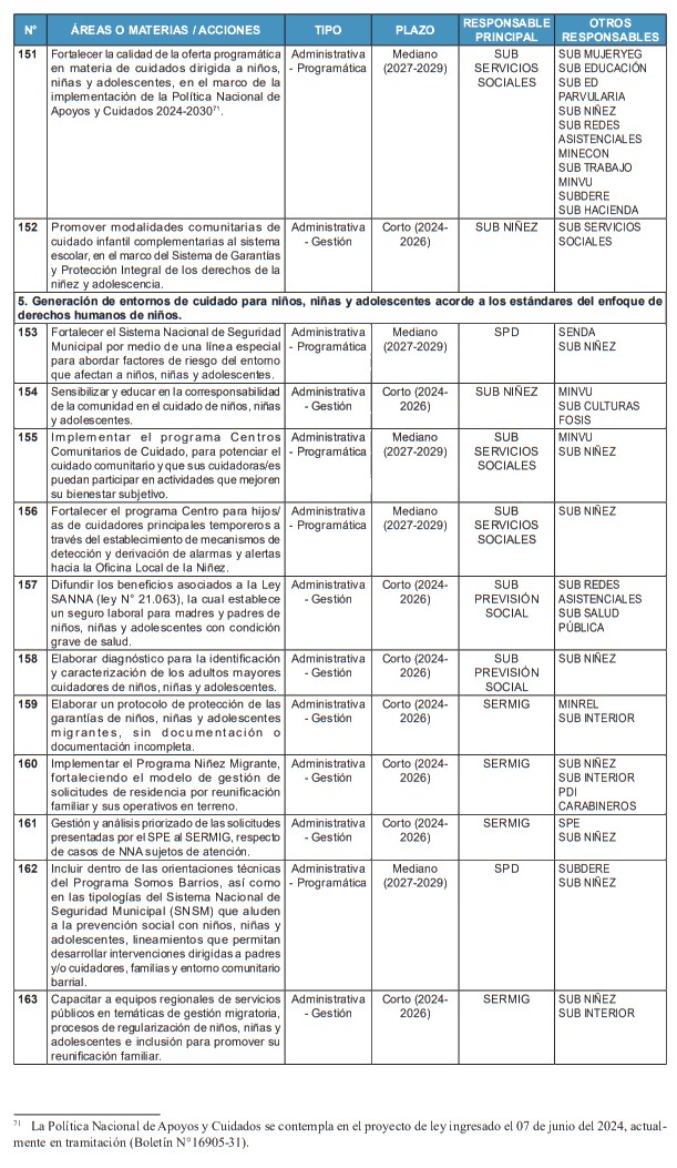 Esta Contraloría General ha dado curso al documento del rubro, mediante el cual se aprueba la Política Nacional de la Niñez y Adolescencia y su Plan de Acción 2024-2032, pero cumple con hacer presente, en especial respecto del resumen de acciones que se viene aprobando, que sin perjuicio de las coordinaciones que resulten procedentes, ello es en el entendido de que cada organismo intervendrá estrictamente en el marco de sus respectivas facultades consagradas en la normativa, en tanto que las medidas propuestas se canalizarán por medio de la vías formalmente dispuestas, según la materia de que se trate.