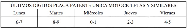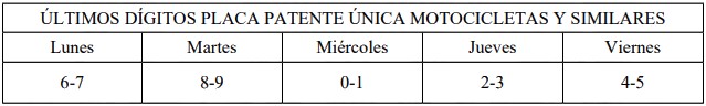 f) Motocicletas y similares, inscritos en el Registro Nacional de Vehículos Motorizados antes del 1 de septiembre de 2010; de lunes a viernes, excepto festivos, entre las 7:30 y las 21:00 horas, dentro de la Provincia de Santiago y comunas de San Bernardo y Puente Alto, según su último dígito de placa patente, conforme al siguiente calendario: