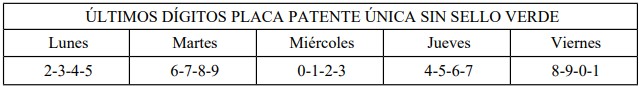 b) Automóviles, station wagons y similares, sin sello verde, motocicletas y similares de años anteriores al año 2002; fuera del perímetro delimitado por el anillo Américo Vespucio, pero dentro de la Provincia de Santiago y comunas de San Bernardo y Puente Alto, de lunes a viernes, excepto festivos, entre las 7:30 y las 21:00 horas, según su último dígito de placa patente, conforme el siguiente calendario semanal: