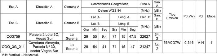 1. Autorízase a la concesionaria instalar, operar y explotar un (1) radioenlace punto a punto, en la Región de Coquimbo, según se indica a continuación: