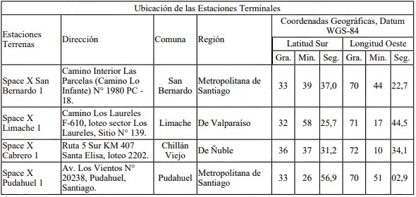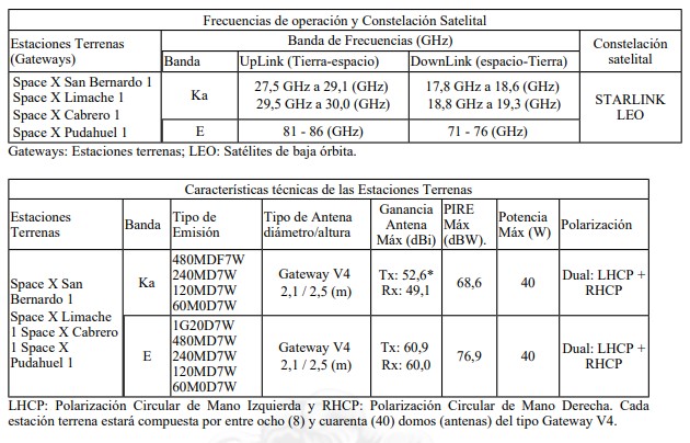 1. Autorízase a la concesionaria para instalar, operar y explotar cuatro (4) Estaciones Terrenas (Gateways), que se conectarán a la Constelación Satelital Starlink, en las bandas de frecuencias para el Servicio Fijo por Satélite, según se indica a continuación: