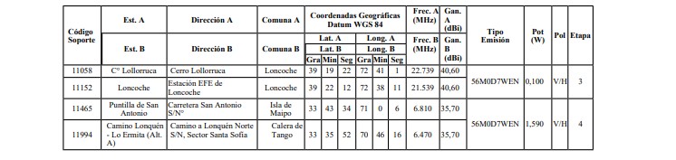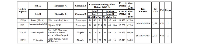 D.O. 23.01.2026 cuatro (4) radioenlaces punto a punto en las regiones: Del Libertador General Bernardo O'Higgins, de La Araucanía, de Ñuble y Metropolitana de Santiago, según se indica a continuación: