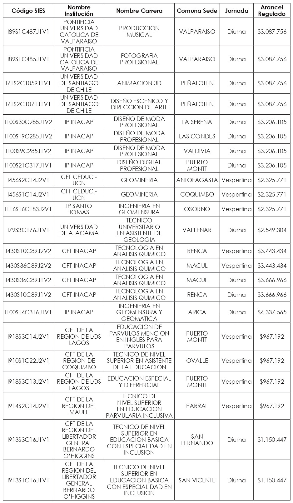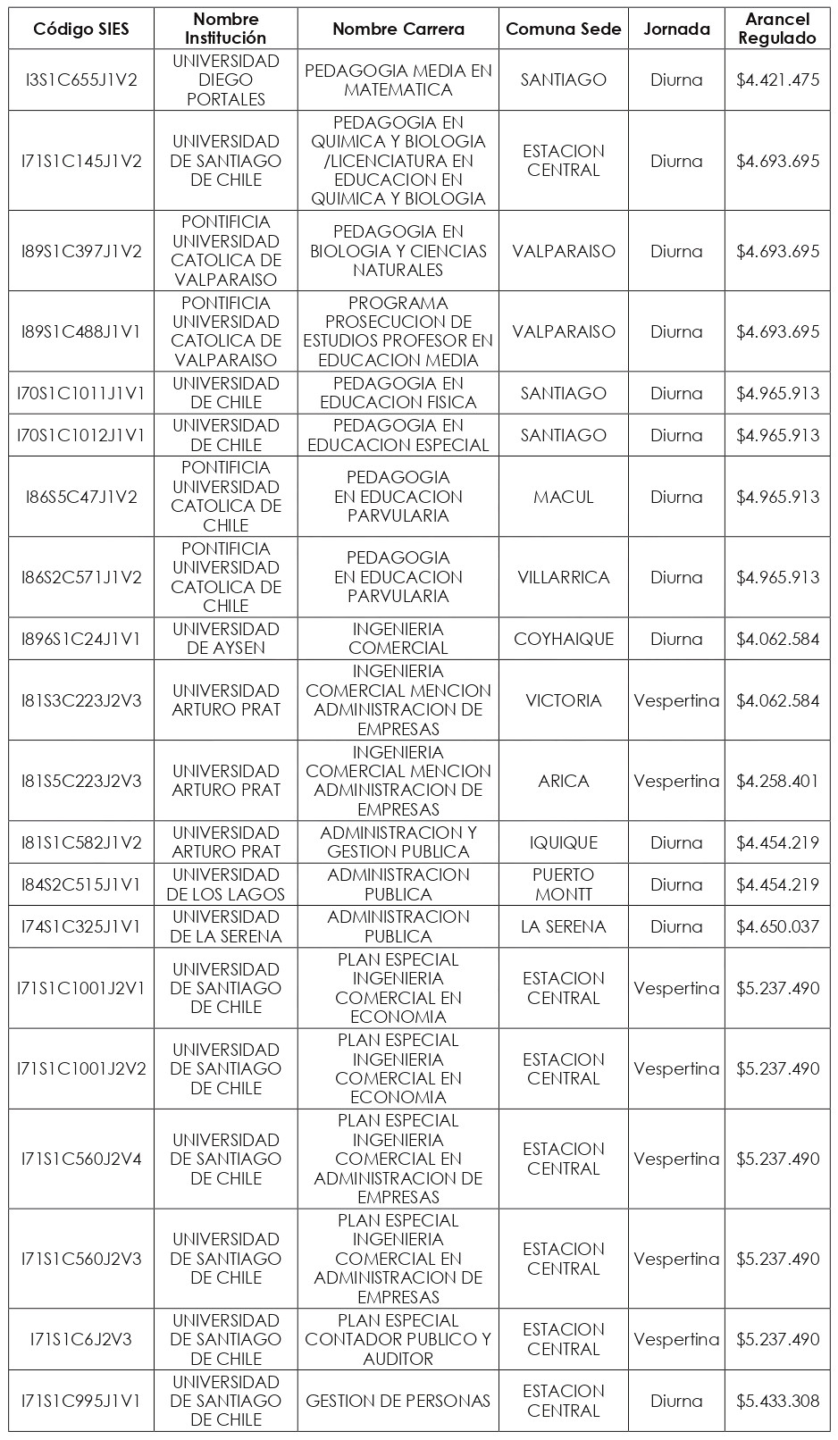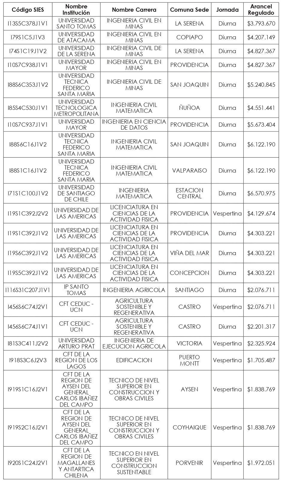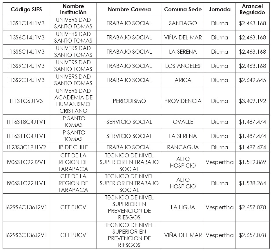 Artículo quinto: Compleméntase la resolución exenta N° 8.088, de 2024, de la Subsecretaría de Educación Superior, incorporándose en su artículo segundo el listado de Valores de Aranceles Regulados, actualizados al año 2025, correspondientes a las nuevas carreras y programas de estudio señalados en los artículos primero y tercero de la presente resolución exenta, expresados en pesos por estudiante, de conformidad a lo dispuesto en el artículo 94 de la ley Nº 21.091.