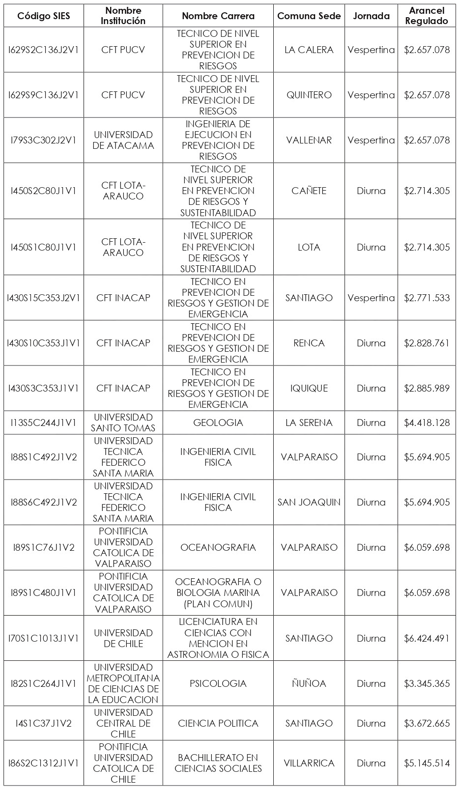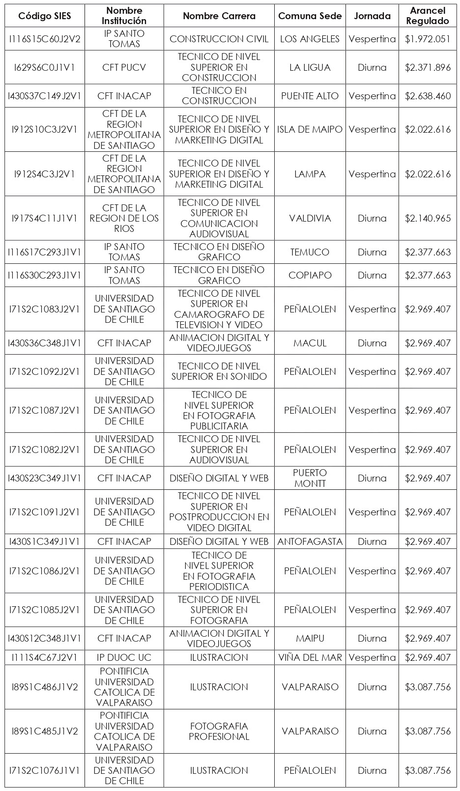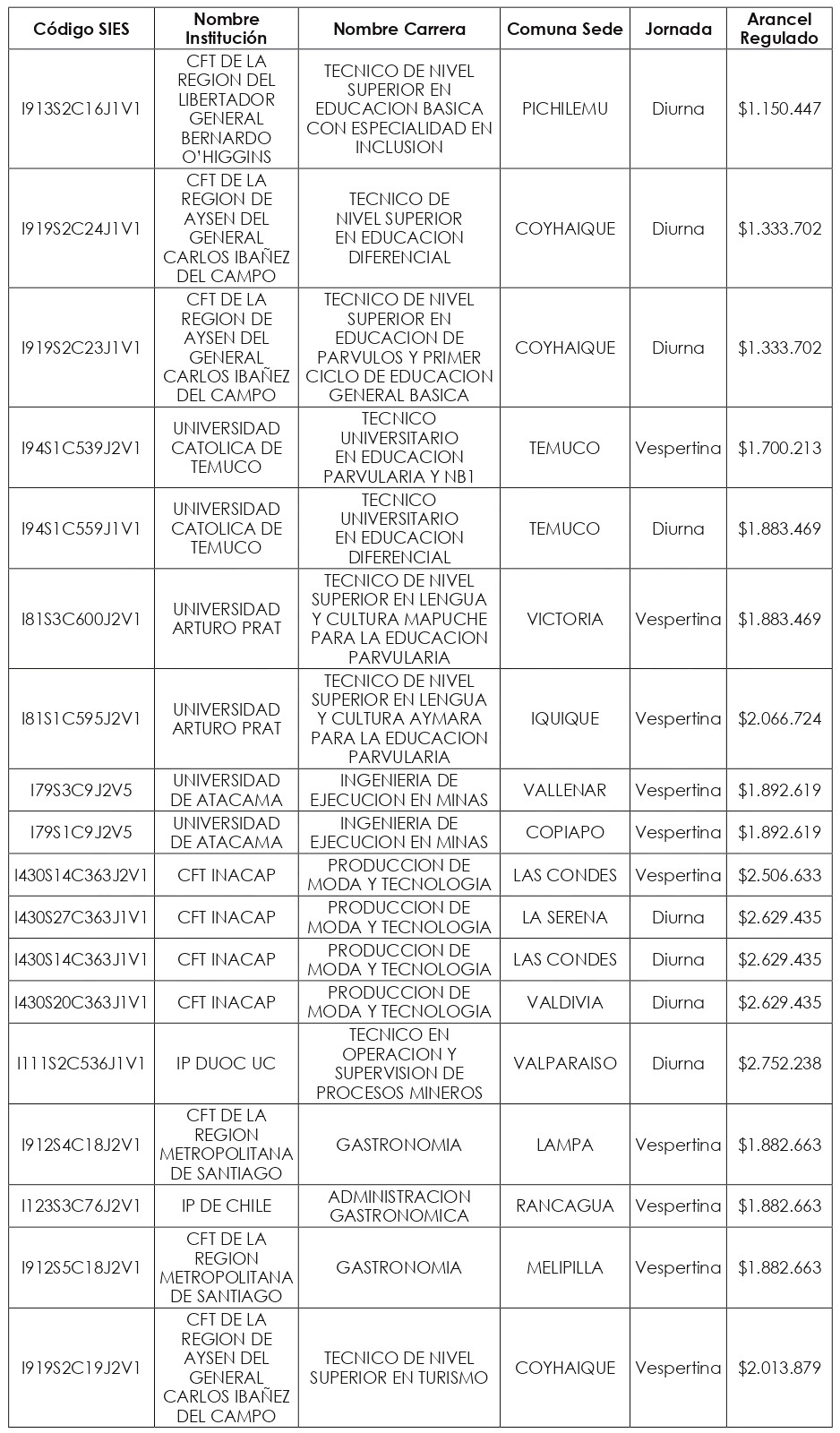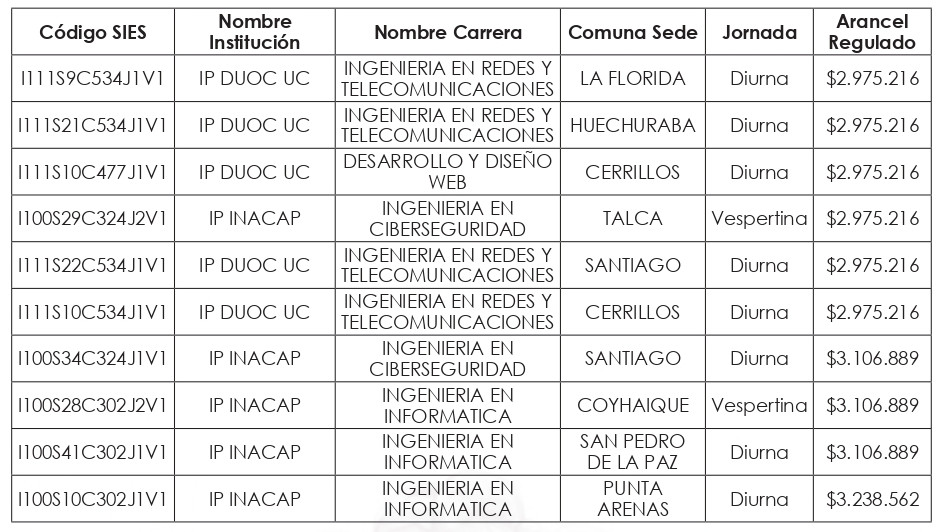 Artículo quinto: Compleméntase la resolución exenta N° 8.088, de 2024, de la Subsecretaría de Educación Superior, incorporándose en su artículo segundo el listado de Valores de Aranceles Regulados, actualizados al año 2025, correspondientes a las nuevas carreras y programas de estudio señalados en los artículos primero y tercero de la presente resolución exenta, expresados en pesos por estudiante, de conformidad a lo dispuesto en el artículo 94 de la ley Nº 21.091.