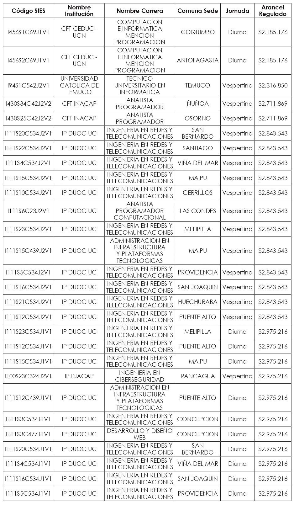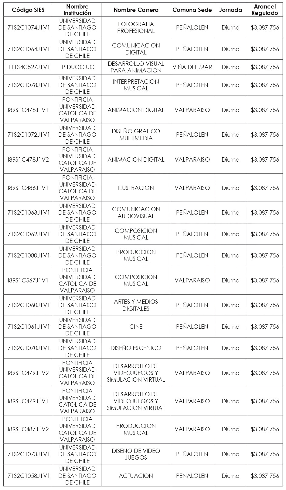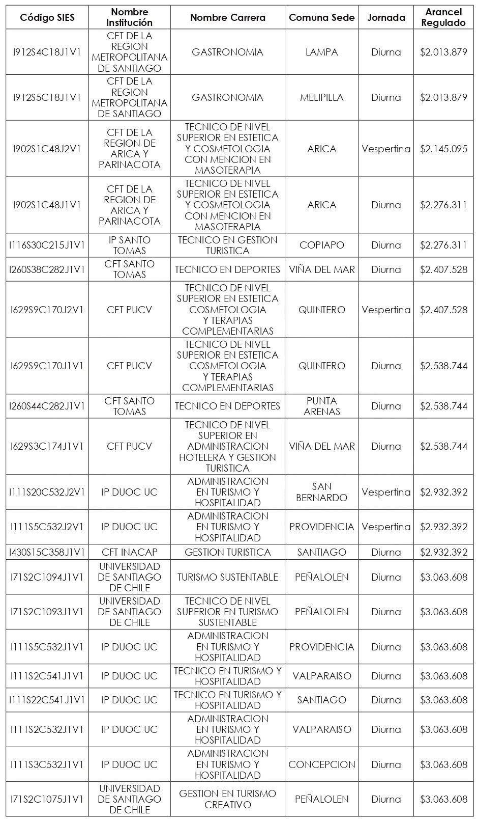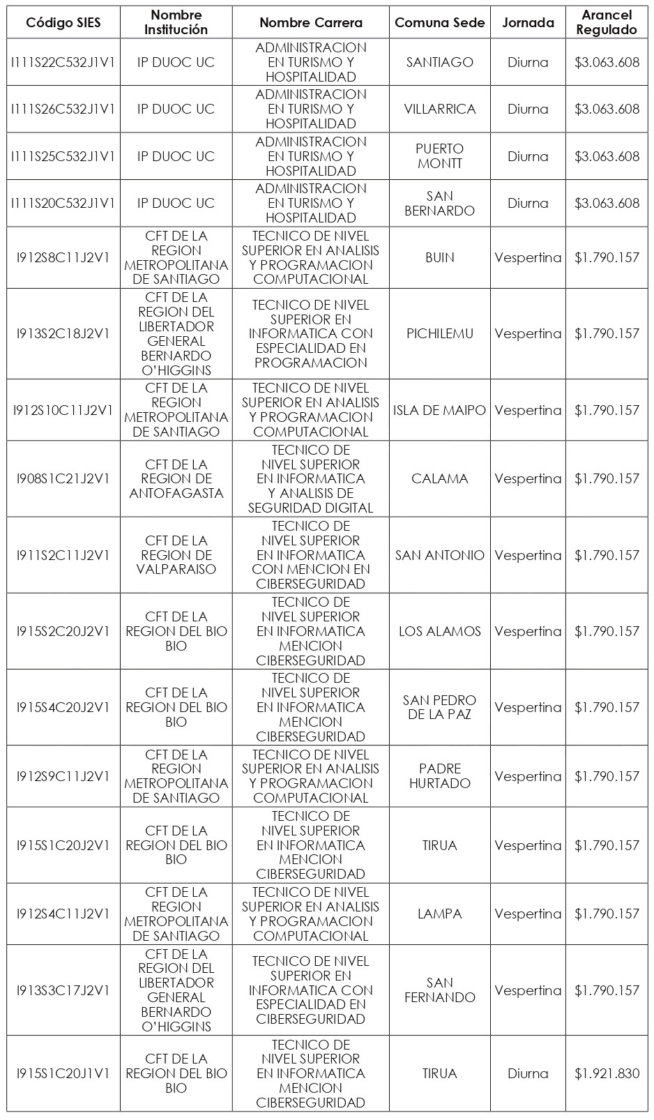 Artículo quinto: Compleméntase la resolución exenta N° 8.088, de 2024, de la Subsecretaría de Educación Superior, incorporándose en su artículo segundo el listado de Valores de Aranceles Regulados, actualizados al año 2025, correspondientes a las nuevas carreras y programas de estudio señalados en los artículos primero y tercero de la presente resolución exenta, expresados en pesos por estudiante, de conformidad a lo dispuesto en el artículo 94 de la ley Nº 21.091.