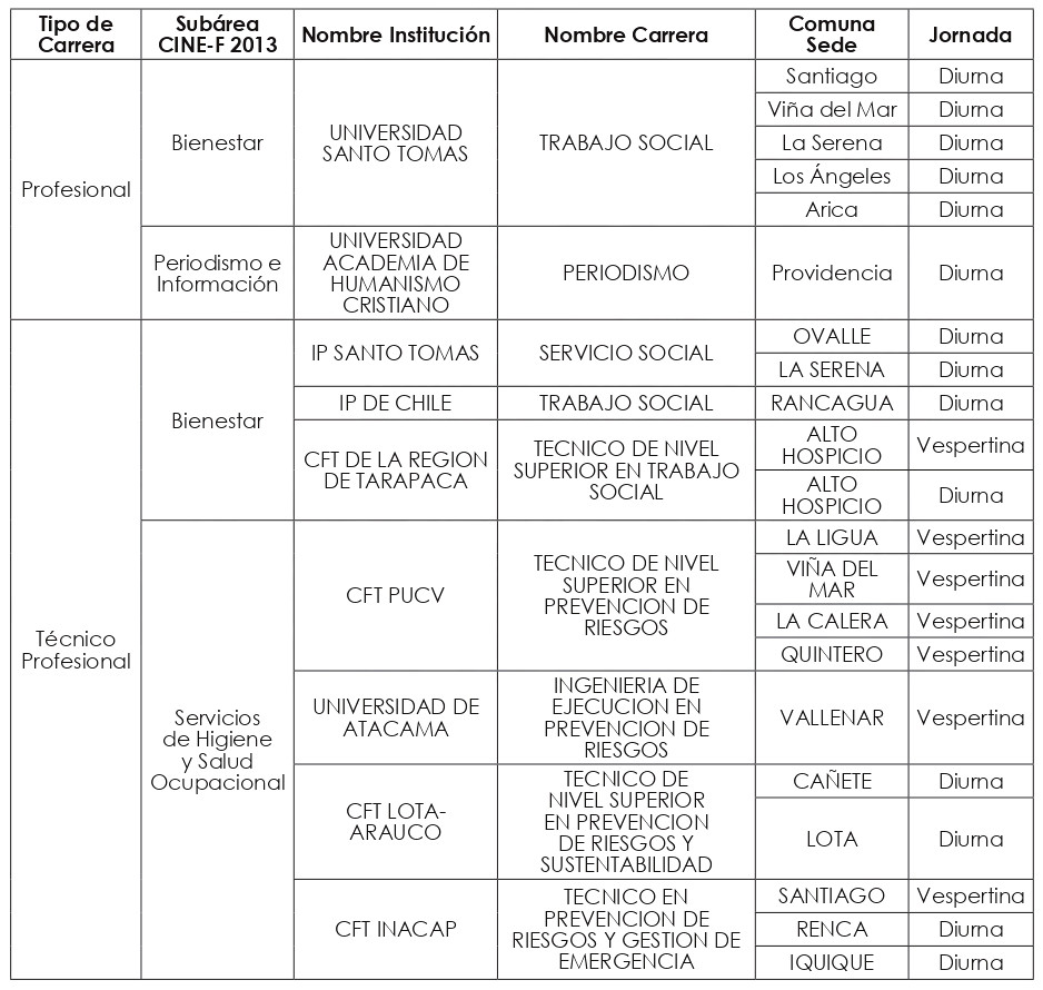 En ese orden de ideas, las Bases Técnicas fijadas en la resolución exenta N° 6.255, de 2022, establecieron en forma expresa cuáles serán las carreras a regular para el año académico 2024, conforme a la metodología establecida en las referidas Bases. Estas corresponden a cuatro "macrogrupos" de carreras, a saber: carreras Profesionales de las subáreas CINE-F 2013 de "Bienestar" y "Periodismo e Información", y carreras Técnico-Profesionales de las subáreas de "Bienestar" y "Servicios de Higiene y Salud Ocupacional".