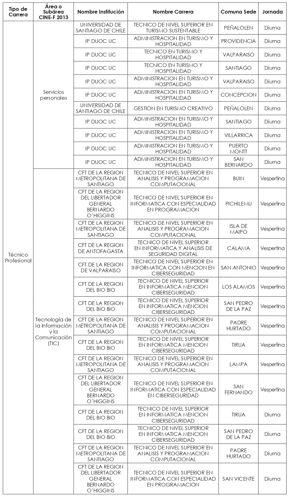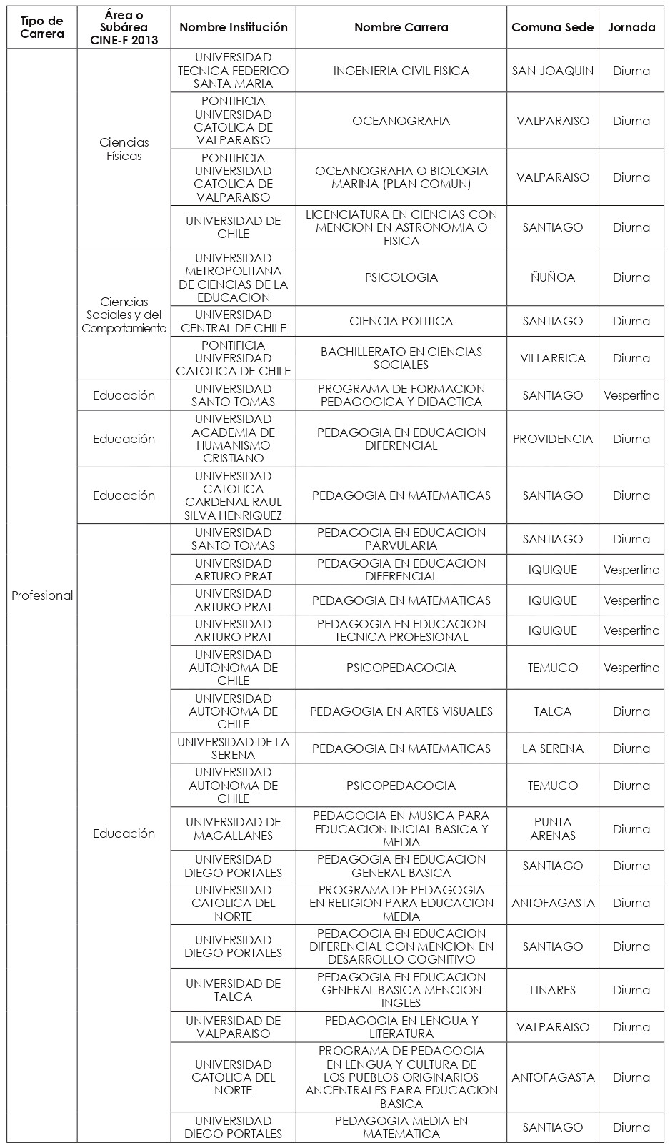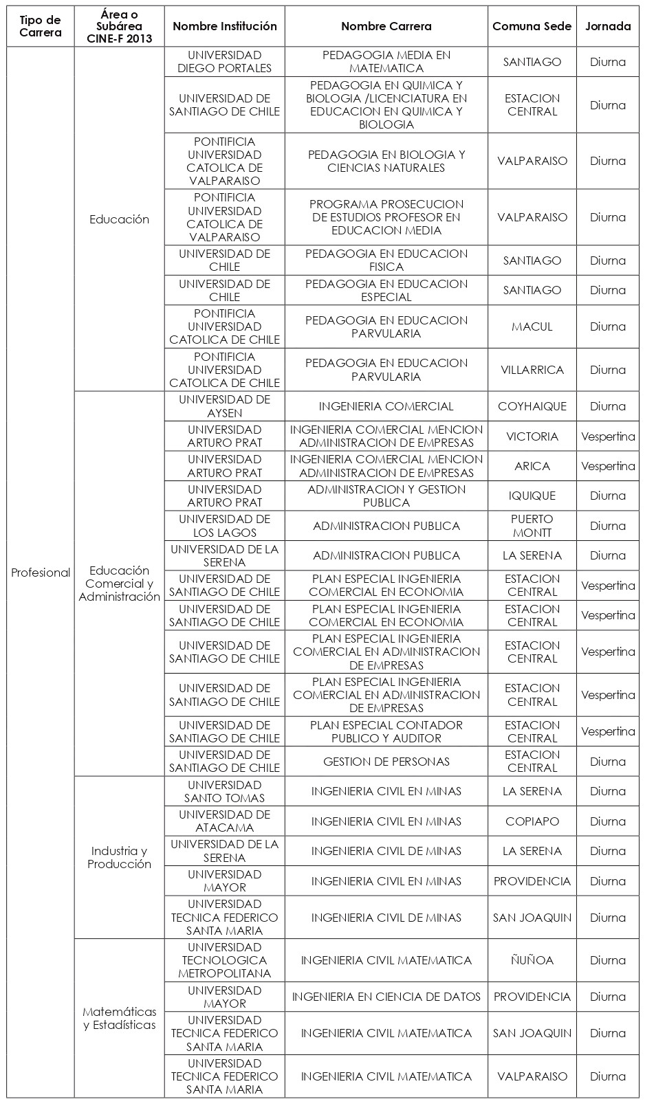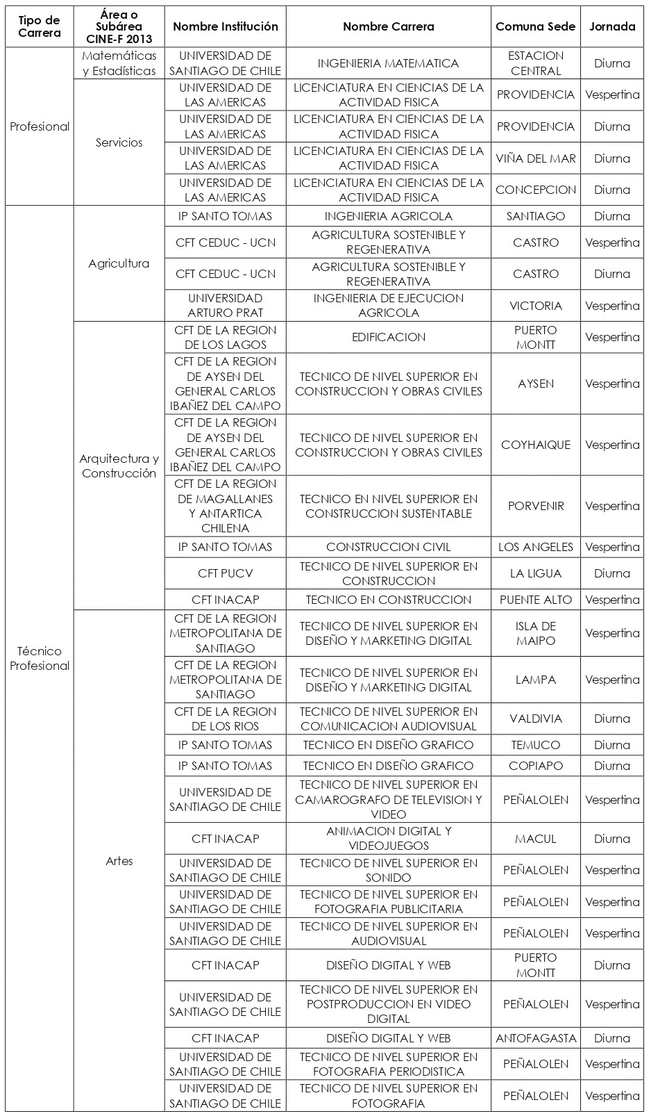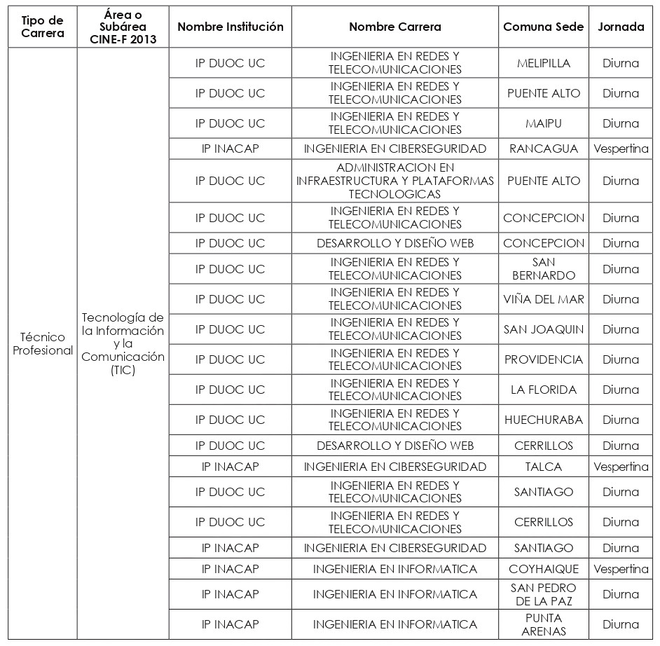 Las nuevas carreras a incorporar a partir del año académico 2025, se clasificaron en quince "macrogrupos", a saber: carreras Profesionales de las subáreas CINE-F 2013 de: "Ciencias Físicas"; "Ciencias Sociales y del Comportamiento"; "Educación"; "Educación Comercial y Administración"; "Industria y Producción"; "Matemáticas y Estadísticas"; y del área CINE-F 2013 de "Servicios"; y carreras Técnico-Profesionales de las subáreas de: "Agricultura"; "Arquitectura y Construcción"; "Artes"; "Ciencias Físicas"; "Educación"; "Industria y Producción"; "Servicios personales"; y "Tecnología de la Información y Comunicación (TIC)".