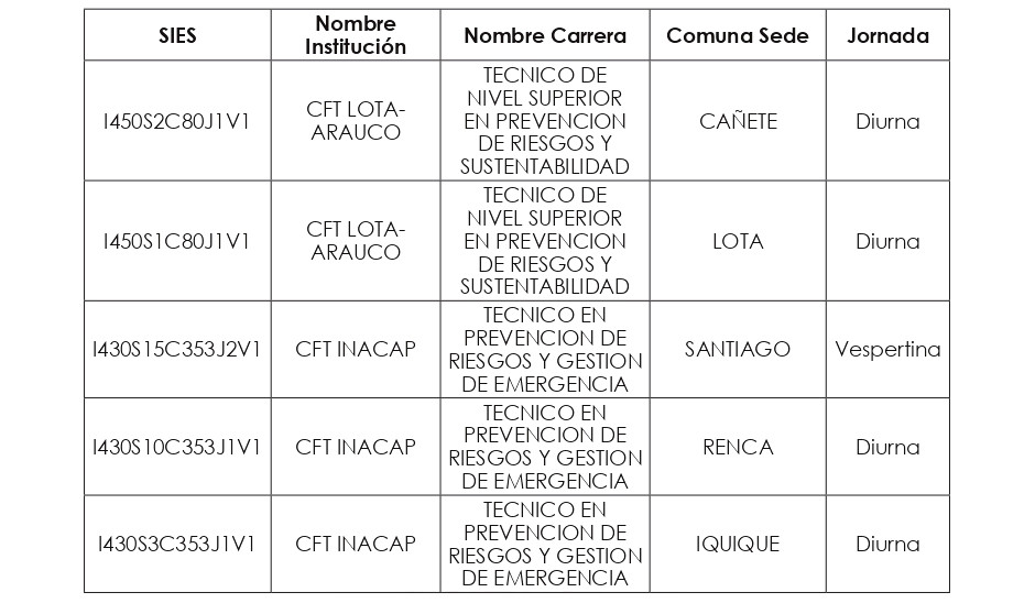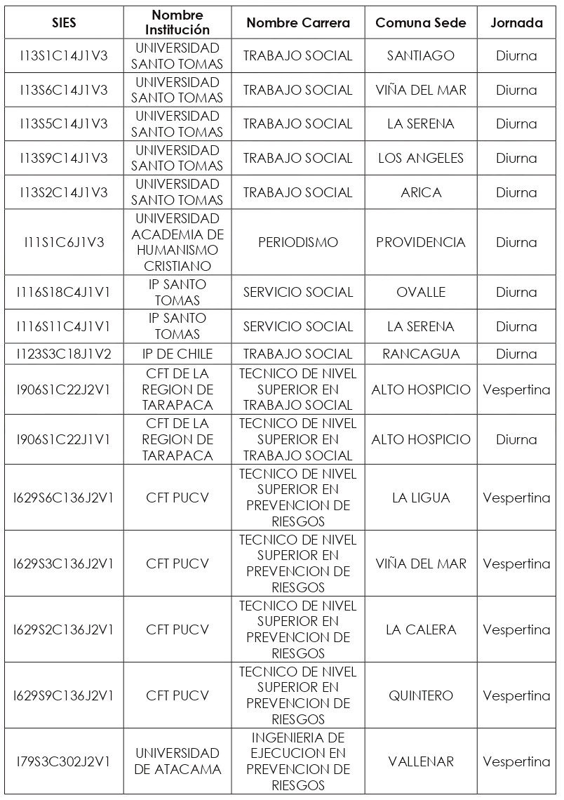 Artículo tercero: Compleméntase la resolución exenta N° 3.882, de 2024, de la Subsecretaría de Educación Superior, y sus modificaciones, en el sentido de incorporar en su artículo segundo el siguiente listado de carreras, correspondiente a los nuevos programas (243) a impartirse el año académico 2025, de conformidad a lo dispuesto en el artículo 93 de la ley N° 21.091: