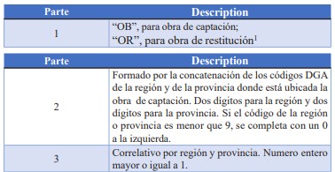 Por ejemplo, el código de obra "OB-0602-7" corresponde a la séptima obra de captación registrada para la Región de O'Higgins (6), provincia de Colchagua (2).