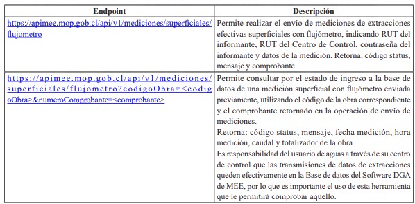 . Endpoint: https://apimee.mop.gob.cl/api/v1/mediciones/superficiales/flujometro