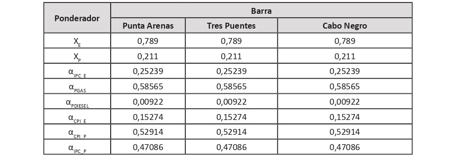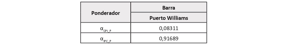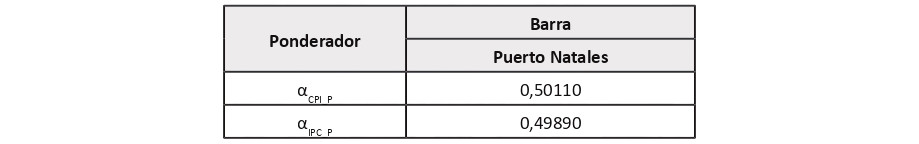 Los ponderadores de cada uno de los índices que componen la fórmula de indexación del costo variable no combustible medio, para los Sistemas Medianos de Punta Arenas, Puerto Natales, Porvenir y Puerto Williams, son los que a continuación se indican: