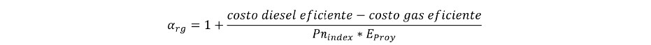 El parámetro αrg se define como el coeficiente que multiplica el precio de la energía base para incorporar la desviación que se haya presentado en los costos eficientes de generación debido al despacho de centrales diésel, gatillado por una restricción en el suministro de gas natural.