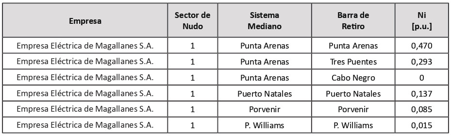 A continuación se indican los valores del parámetro Ni en cada una de las barras de retiro consideradas para efectos de representar los costos de generación-transporte en su estructura de precios a nivel de distribución.