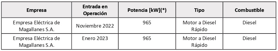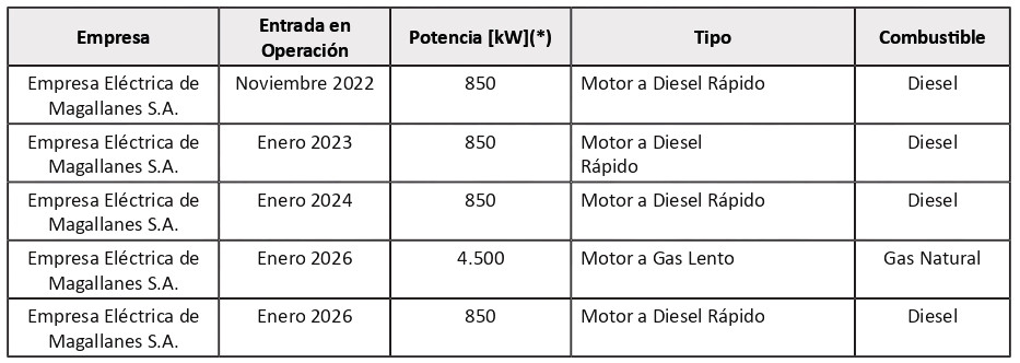 Para el Sistema Mediano de Puerto Natales, la siguiente empresa será responsable de la ejecución y construcción de las obras de generación que a continuación se indican: