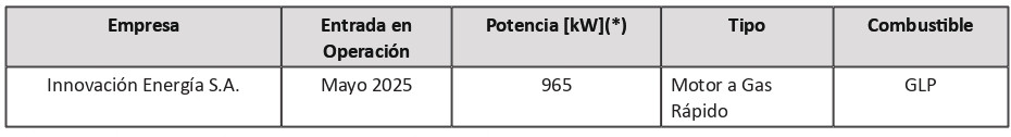 (*) = La capacidad instalada de generación deberá ser a lo menos la indicada en la presente tabla.
